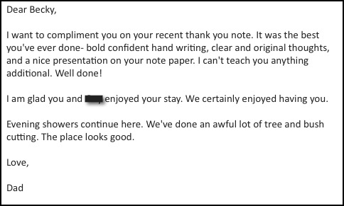 My dad’s side of the family was militant about them. I remember my grandmother sending my thank you note back (during college) with spelling and punctuation corrections. My husband and I visited my father & M in late June 2013. Knowing how much he enjoyed reading a heartfelt thank you note, I took my time to make sure I touched on all the highlights of our visit: M’s great meals, our lunch & visit to Edgefield, the two Camellia’s they sent home with us, etc. About a week later, he sent me an email.