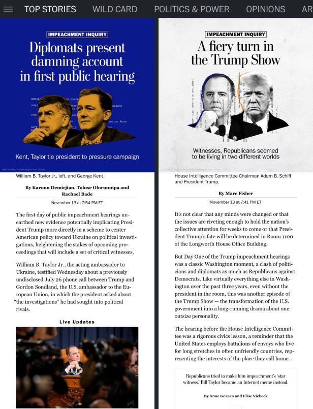 I found The Washington Post iPad app (right) laborious to navigate. It always opens to two articles taking up the whole screen and you have to enlarge one of them to be big enough to read. To get back, you have to double tap again or tap on the upper left-hand corner to get a list of other articles (no graphics or context to them). Their iPad app feels like an afterthought.