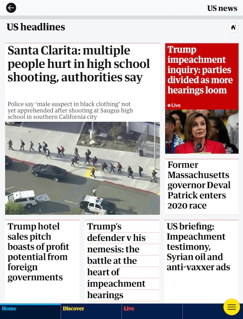 When the iPad was introduced in 2010, one of the selling points was readability. Reading an electronic “newspaper” was one of the first examples on how useful this tool could be. The App Store is mature enough now that we should have a minimal expectation of functionality, especially with media. When I open The Guardian app on the iPad (right), I see a well-curated range of articles and it’s easy to navigate. Color is used effectively—a red block means it’s a Live Feed (continuously updated throughout the day). If I have read an article, the title turns a lighter shade of gray.